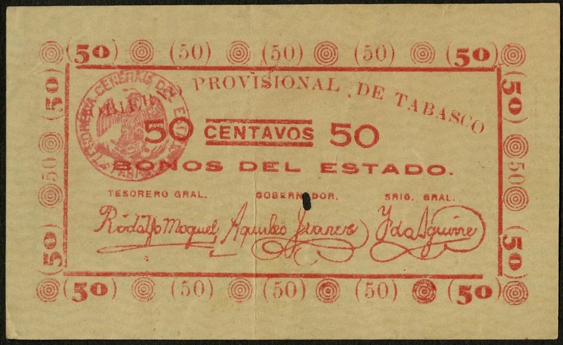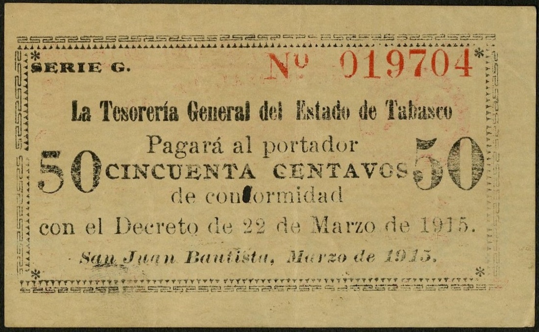 Mexico. Revolutionary. Tabasco. La Tesorería General del Estado de Tabasco, San Juan Bautista. 50 Centavos. 1915. Scarce. Single spindle hole at center. VF.