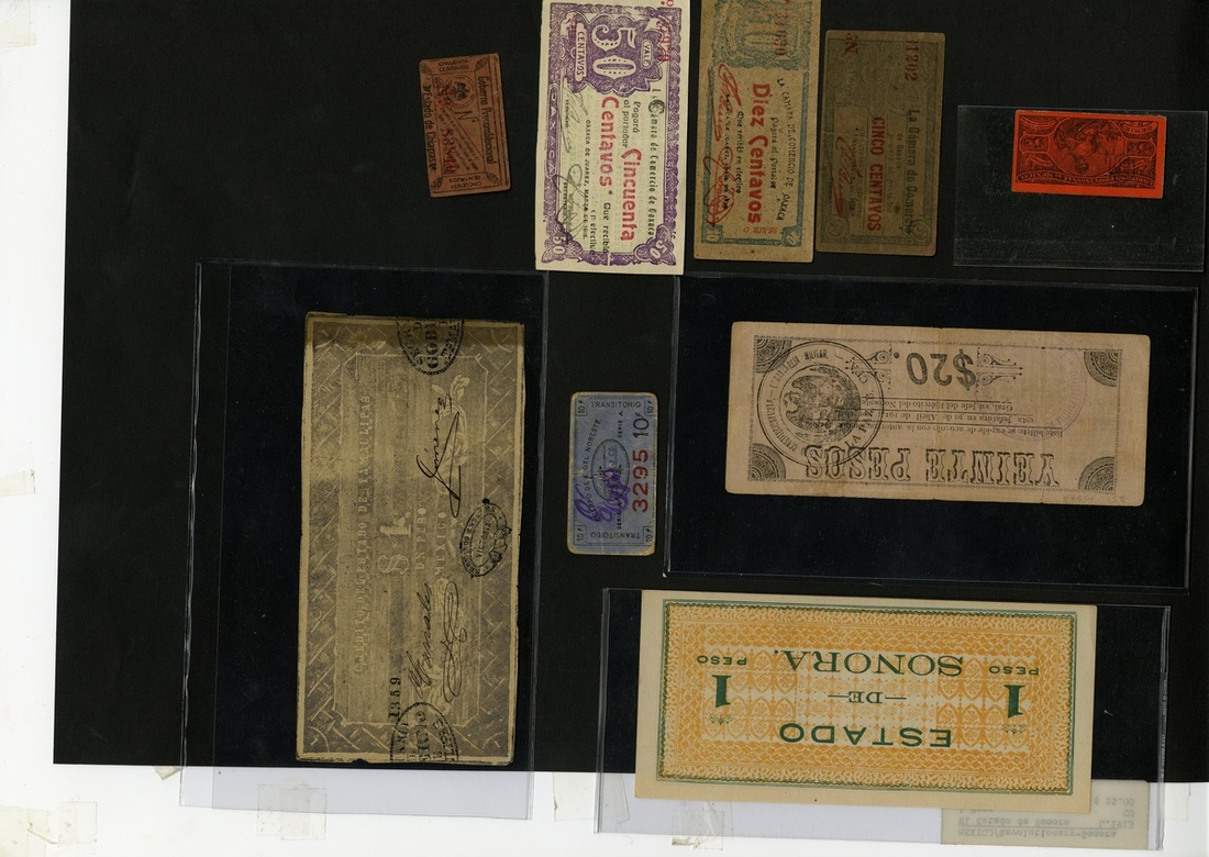 Mexico. Varied Lot of Revolutionary issues and others. Baja California. Gobierno Constitucionalista Territorio de la Baja CFA, La Paz. 20 Pesos. 1914. P-S512. Tear at top into $ of "$20", Fine details; Chiapas. 50 Centavos, 1915. P-S520a. VF-EF; Distrito Federal. 5 Centavos. P-S697. Light stain, Unc.; El Estado de Sonora, Hermosillo. 1 Peso. P-S1066c. CU; Credito del Estado de Tamaulipas. 1 Peso. 1876. Governor Servando Canales. Tams.10. Tear at bottom into border. Fine; Nuevo Leon. Cuerpo de E. del Noroeste. 10 Centavos. NL.34. Fine; Camara de Comercio de Oaxaca. 5, 10 and 50 Centavos. 1915. Oax.37, 38, 39. Fine, VF, EF.