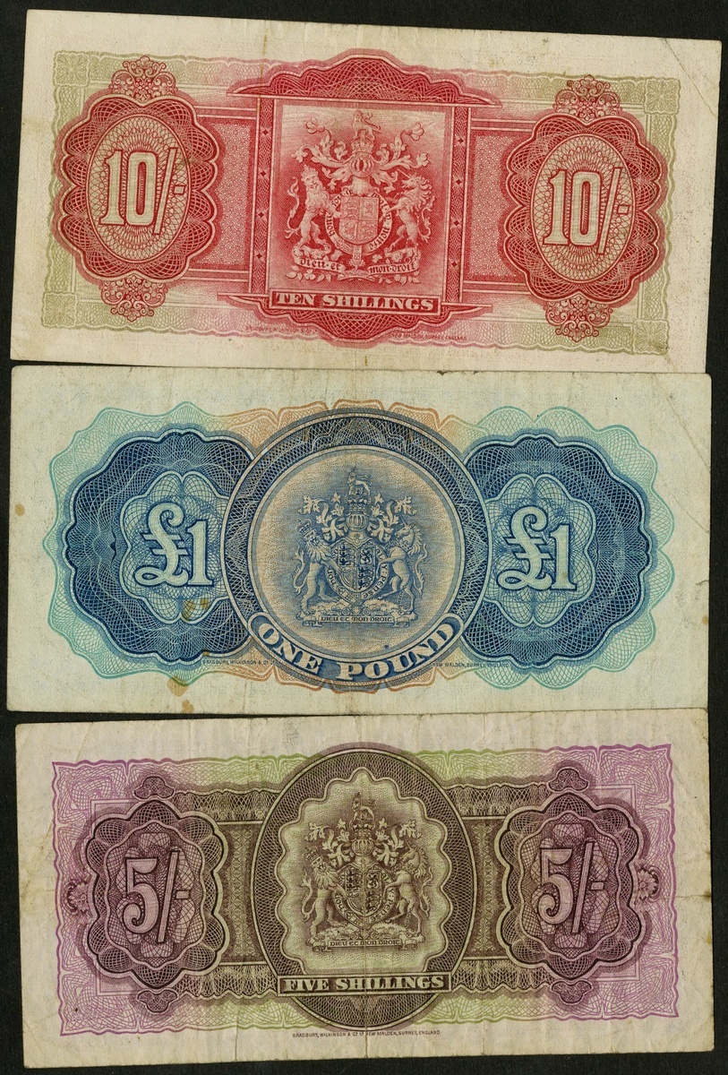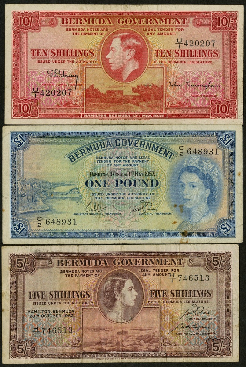 Bermuda. Bermuda Government. Lot. 10 Shillings. 1937. P-10b. George VI portrait above Gates Fort at center. Very Fine; 5 Shillings. 1952. Elizabeth II portrait above Hamilton Harbor at center. P-18a. Fine; and 1 Pound. 1957. P-20b. Elizabeth II at right, bridge at left. Some scattered spots. About VF. [3]