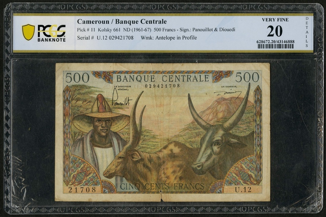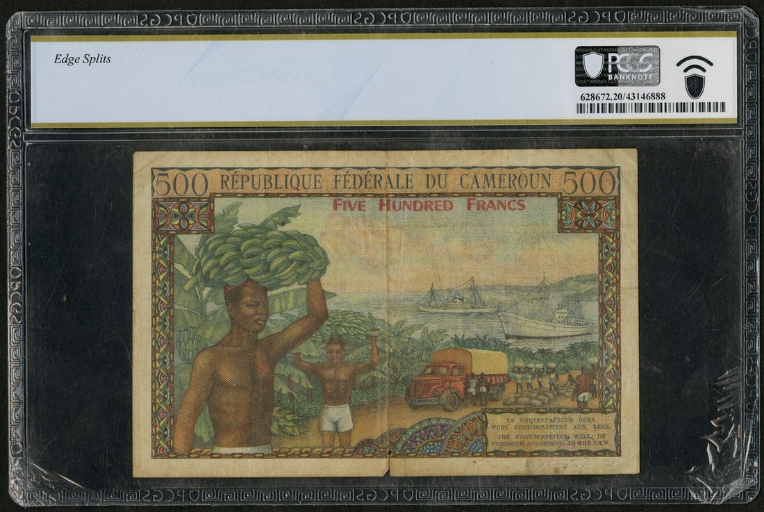 Cameroun. Banque Centrale. 500 Francs ND (1961-67). P-11. Multicolor. Man with two oxen; Man carrying stalks of bananas, truck on road, ships on back. PCGS Very Fine 20; edge splits.