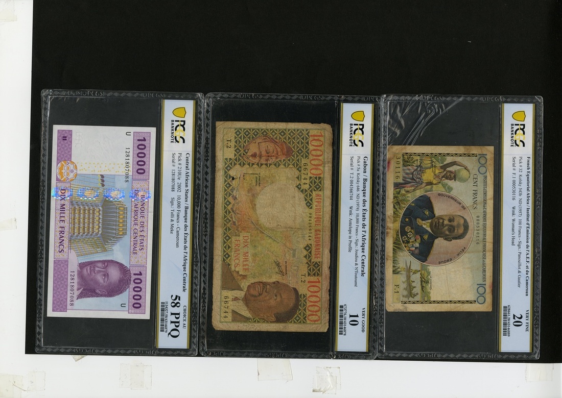 Central African Trio. French Equatorial Africa. 100 Francs. P-32. PCGS Very Fine 20; stains; Gabon. 10,000 Francs. P-5a. PCGS Very Good 10; minor internal tear; and Central African States. 10,000 Francs. P-210U. PCGS Choice AU 58 PPQ. [3]