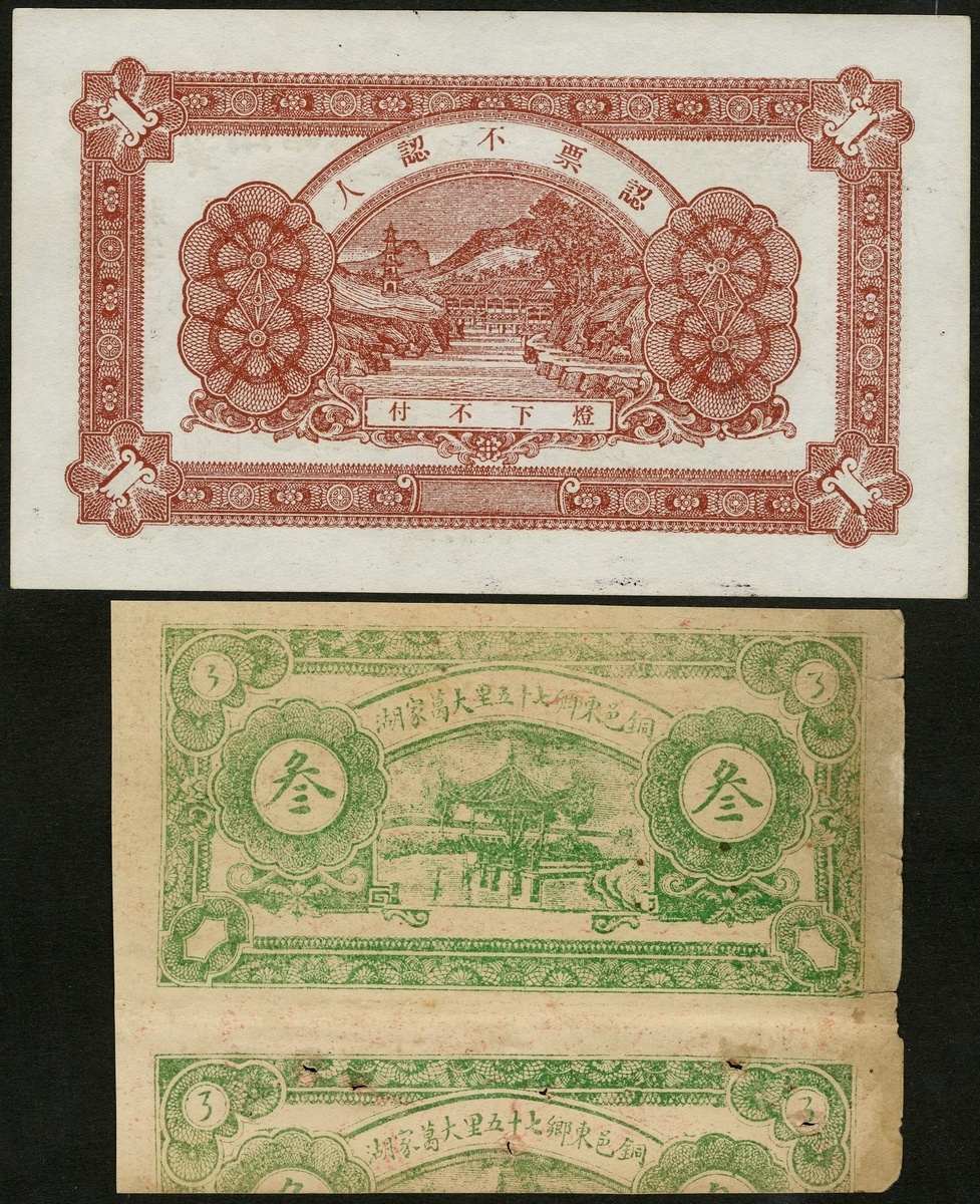China. Imperial-Republic. Uncertain Private issues (3). Blue on yellow, on pink, on pale green; lake and mountainous cascade scene on blue backs. EF-AU [3]