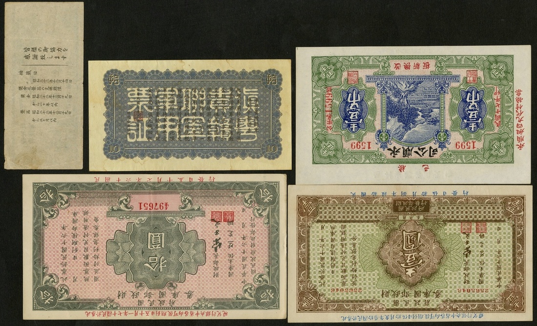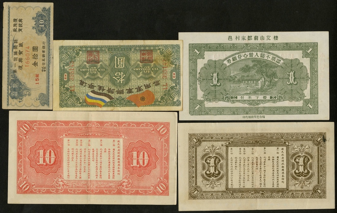China. Imperial-Republic. Uncertain Private issues (5). 10 Dollars. Green, Republic flag and multicolor flag/Blue back; 10 Dollars. Black on pink; 1 Dollar. Green, blue on pink. Country palace at center/Lakehouse center of green back; 1 Dollar. Brown on green; and other. VF-EF. [5]