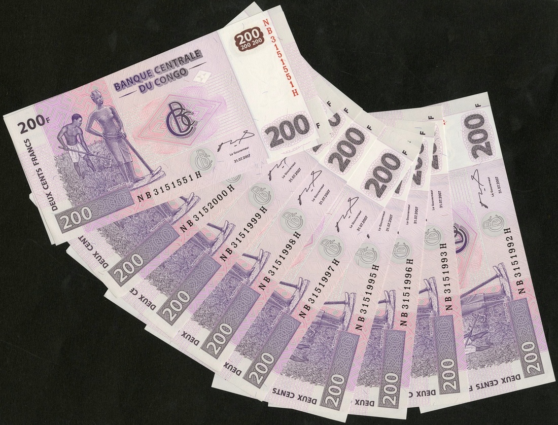 Congo Democratic Republic. Banque Centrale du Congo. Sequential group of 200 Francs. 2007. P-99. NB 3151992 H-NB 3152000 H. Man and woman working in the field at left; also 1 non-sequential. One tiny cornertip fold so AU, otherwise CU. [10]