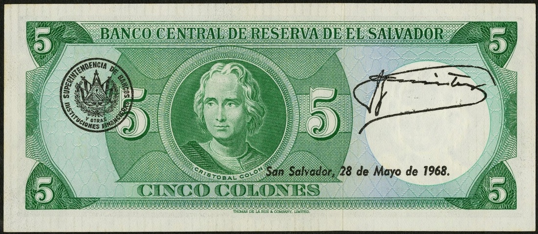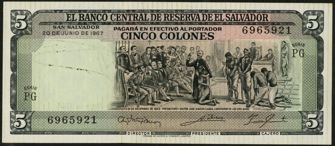 El Salvador. Banco Centra; de Reserva. 5 Colones. 1967. P-109a. Juan José Cañas freeing the slaves; Columbus portrait at center of back. CU.
