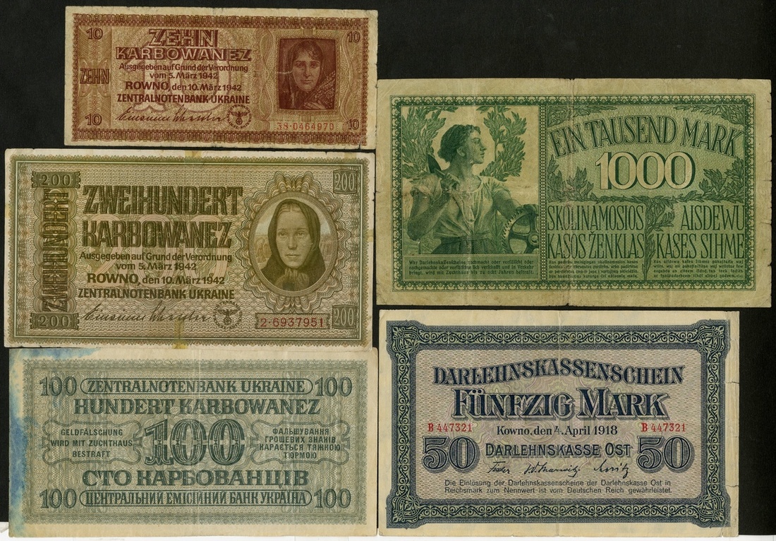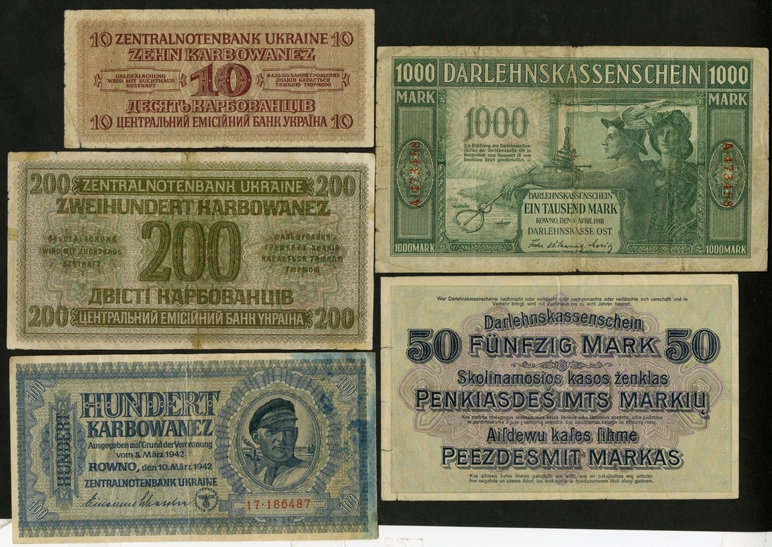 German Occupation of the Eastern Regions Lot. Kowno (Kaunas). 50 Mark. P-R132. Two small edge tears, Fine; 1000 Mark. P-R134. VG; and Ukraine. 10, 100 and 200 Karbowanez. P-52, 55, 56. VG; blue stain at edge About VF; tape stains at edges Fine. [5]