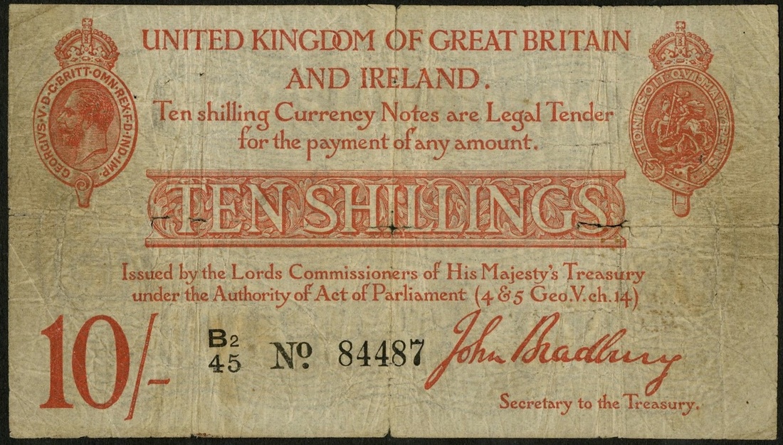 Great Britain. Treasury Note. 10 Shillings. ND (Jan. 1915). P-348. Red. George V portrait upper left. Small center splits from folding. VG.