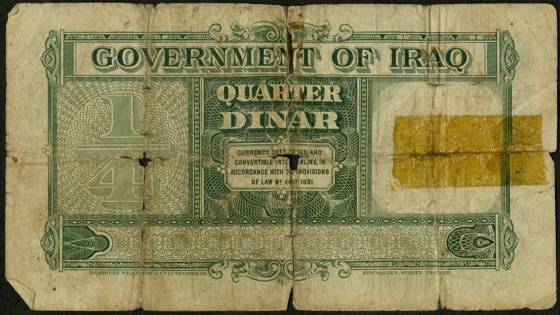 Iraq. Kingdom. Government of Iraq. ¼ Dinar. Law of 1931 (1942). P-16. Child portrait of King Faisal II at right. Separations old tape backed in two spots. Good.