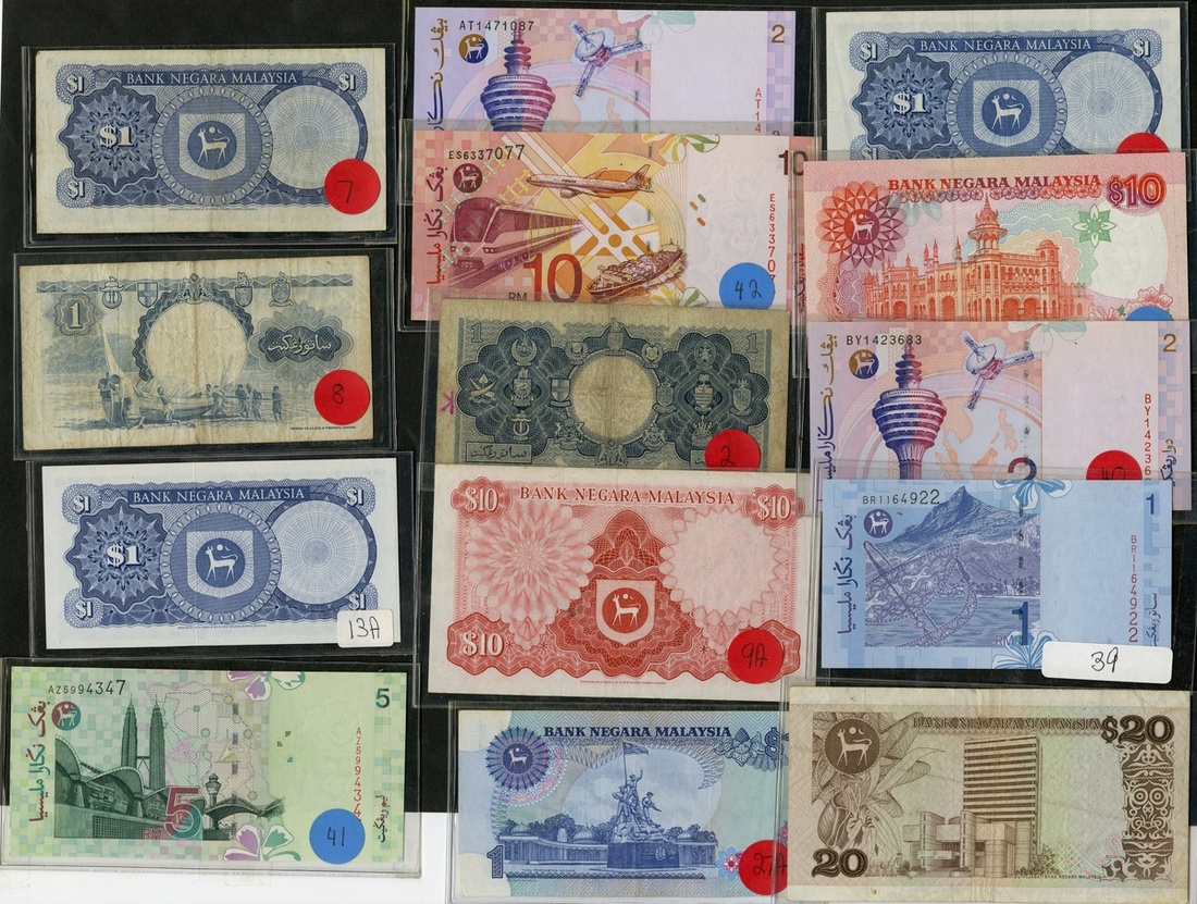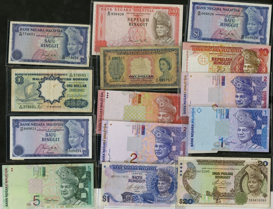Malay Lot. Malaya & North Borneo. 1 Dollar, 1953. P-2 inked letter on back, VG; 1 Dollar 1959. P-8 Fine; and Malaysia. Bank Negara Malaysia P-1, 7, 9, 13a, 22, 27a, 39b, 40 (2), 41, 42, and 48. VF-Unc. [14]