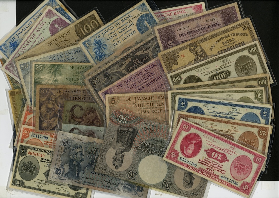 Netherlands East Indies. Lot. Da Javasche Bank. P-69c, 78a, c, 79a, b, 80a, 81 (two corners nibbled, About Fine), 87, 88, 90, 91, 93, 94, 97 (2), 98 (2), 99; Government-Muntbiljet. P-108a, 109, 110a (2), 111a (2), 112a, 113a (4), 114a, 115a, 116a, 117a (2); and Dai Nippon Teikohu Seihu. P-131. Generally About Fine-EF.