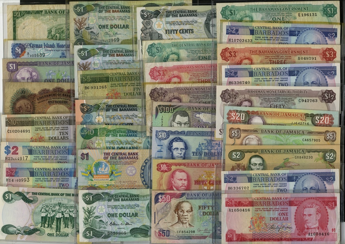 Caribbean. Commonwealth Lot. Bahamas. P-18b, 19a, 26 (2), 28, 35a, 42, 43a, b, 50a, 59, 68, 69 (2). Fine-Unc; Barbados. 1 Dollar, 1939, P-2b VG; P-29, 30 (3), 32, 35 EF, 46 (2). The P-32 Fine, the others VF-EF; Cayman Islands. P-30a CU; Jamaica. P-51Ad, 51Be, 51Cb. Fine-VF, others 1970-1998 (8). [35]