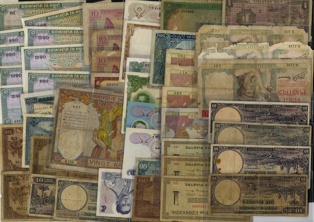 Southeast Asian Large Lot. Includes: French Indo China P-48 (9), 50 Poor, 54 (9), 55 (7), 60 (2), 73 (2), 74 (6), 76 (3), 80 (6), 81 (4), 82 (2), 85 (4), 86 (6), 87, 88 (3), 89 (2), 90, 91 (3), 93, 94 (11), 95 (4), 96 (6), 106. Fair-Fine; Cambodia (approx. 262). 1960s-2002. Much duplication. VG-EF; Laos (3) Fine-VF; Thailand (9) EF-Unc; and WWII Japanese Occupation Money (approx.251) - mostly 10 Peso notes. Fine-Unc