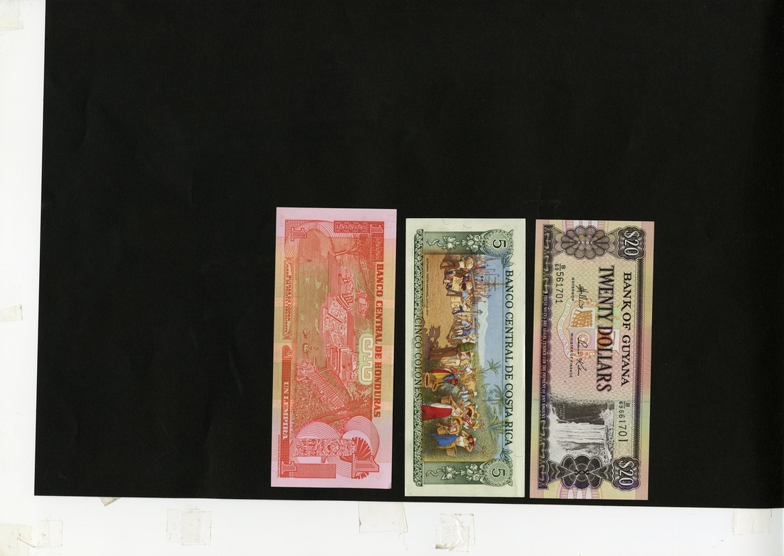 World Banknotes. Trio of sequential Stacks: Guyana. 20 Dollars. P-30. Stack of 100; Honduras 1 Lempira. P-84c. Stack of 100; and Costa Rica. 5 Colones. 1989. P-236d. Stack of 50. All sequentially numbered. CU.