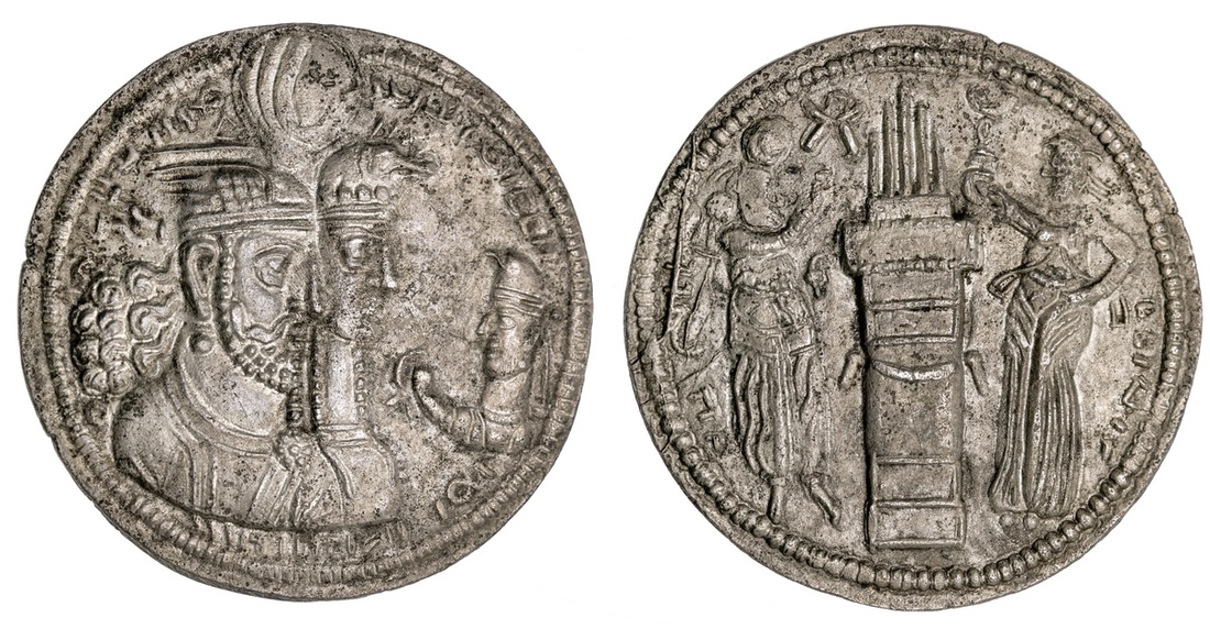 Sasanian Empire. Varahran (Bahram) II with Queen and Prince (276-293). AR Drachm. 3.81 gms. Jugate busts of Bahram, wearing winged crown with korymbos, and his queen, wearing kolah with a boar's head, right vis-à-vis bust left of Prince presenting wreath and kolah with eagle's head, rev. Fire altar with ribbon flanked by Bahram and his queen holding ring. Small reverse die break. Lightly toned. Extremely Fine.