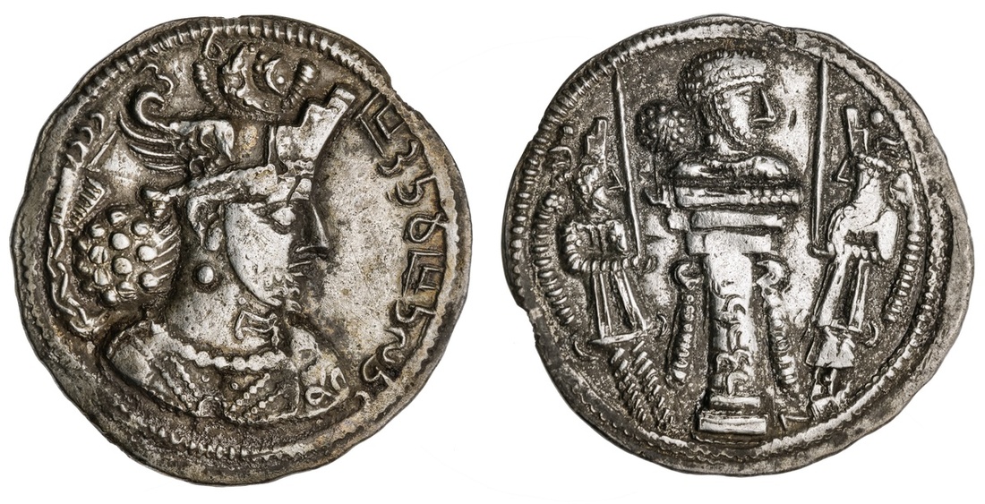 Sasanian Empire. Bahram IV (388-399). AR Drachm. Herat. 3.81 gms. Crowned bust right, rev. Fire altar with ribbons, flanked by attendants, bust surmounting altar, mint signature on altar shaft. Göbl I/1. Minor deposits in peripheries. Very Fine.