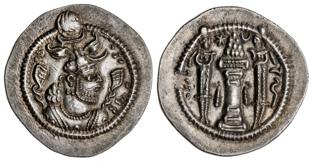 Sasanian Empire. Peroz (Firuz) (457/9-484). AR Drachm. WH (Veh Ardashir) mint, regnal year 14. 4.15 gms. Crowned bust right, crescent above brow, rev. Fire altar with attendants. Göbl III/1. Bold strike. Extremely Fine.