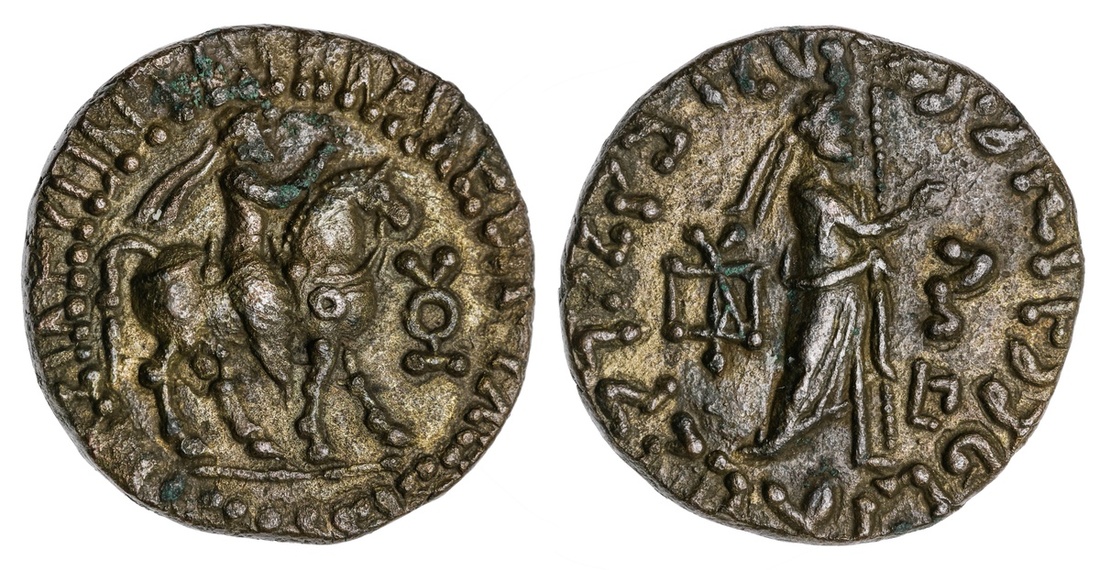 Indo-Parthian. Abdagases (ca. 5-19/20 AD). Billon Tetradrachm. 9.64 gms. King on horseback right, tamgha before, rev. Zeus standing ¾ right holding scepter, monogram behind, Kharosthi sam above pra at right. Senior 228.55T. Toned. Extremely Fine.