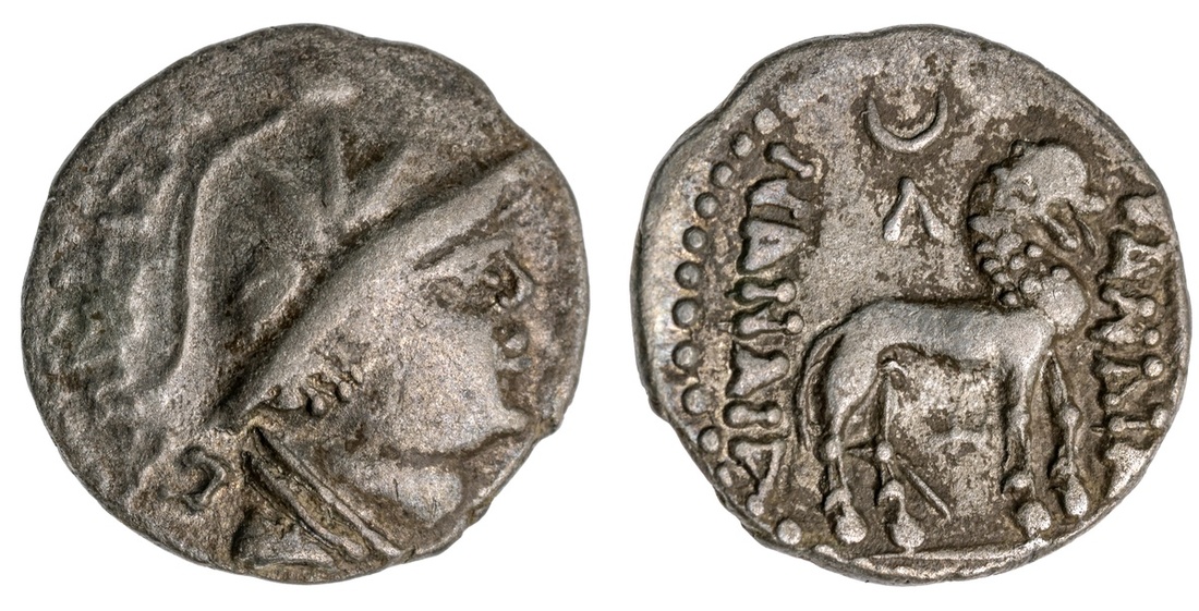Baktria. Yueh Chi. Sapadbizes (late 1st Century BC). AR Hemidrachm. 1.87 gms. Draped bust right wearing Baktrian helmet, rev. Lion standing right, lambda and crescent above. Alram 1259, MACW 2824-8. Very Fine.