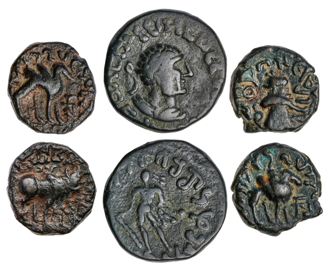 Kushan Empire. Kujula Kadphises (ca. 30/50-80). AE Trio. AE Tetradrachm. 7.61 gms. Diademed and draped Hermaois bust right/Herakles; Dichalkon (2). Bull right, nandipada above, Kharosthi pu<: before/Camel right, Kharosthi dhra before. Senior B11.2, Donum Burns 45var. Very Fine. (3)