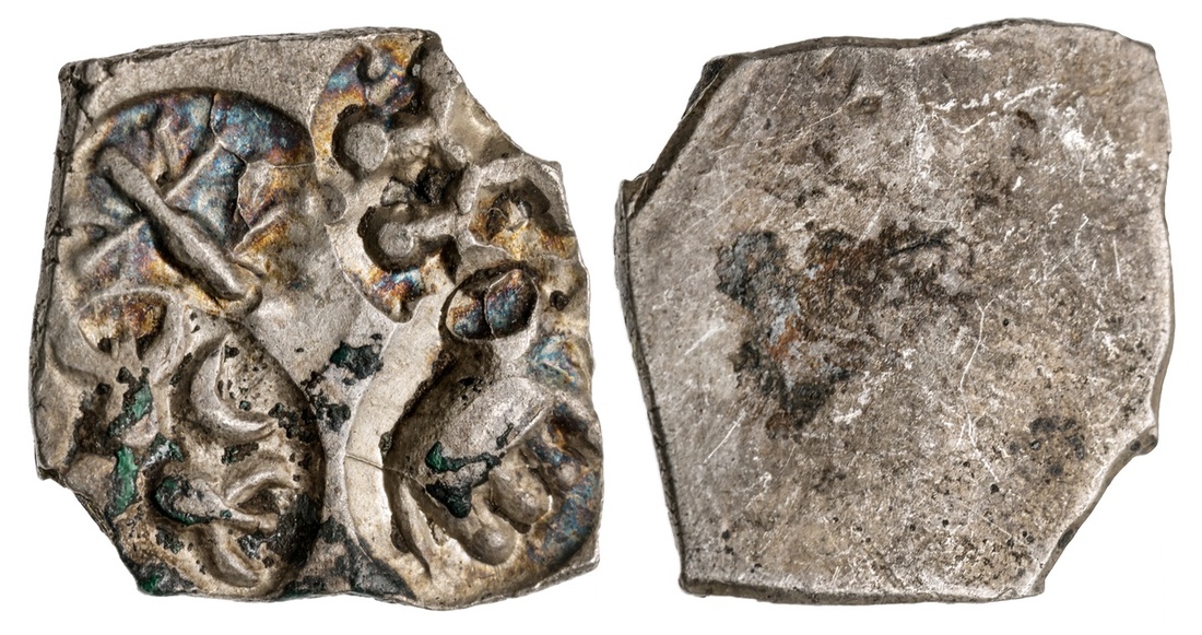 Ancient India. Ashmaka. Punchmarked coinage. AR Half Karshapana, ca. 500-350 BC. 1.68 gms. Four punches - elephant, six-armed symbol with crescents, geometric pattern and ashmaka tree. Rare. Toned over very light deposits. Very Fine.