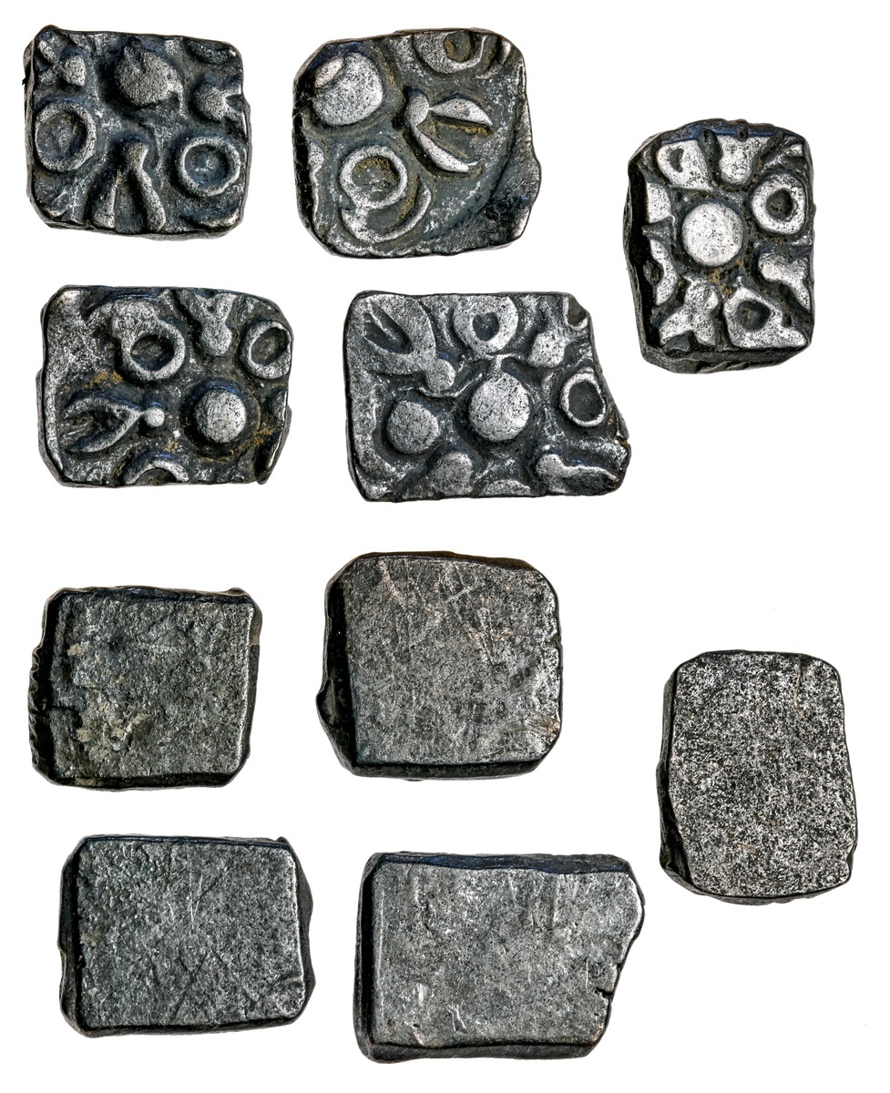 Ancient India. Avanti. Punchmarked coinage. Group of AR ¼ Karshapana, 5th Century BC. Large pellet with taurine and geometric symbols around. Toned. Very Fine. (5)