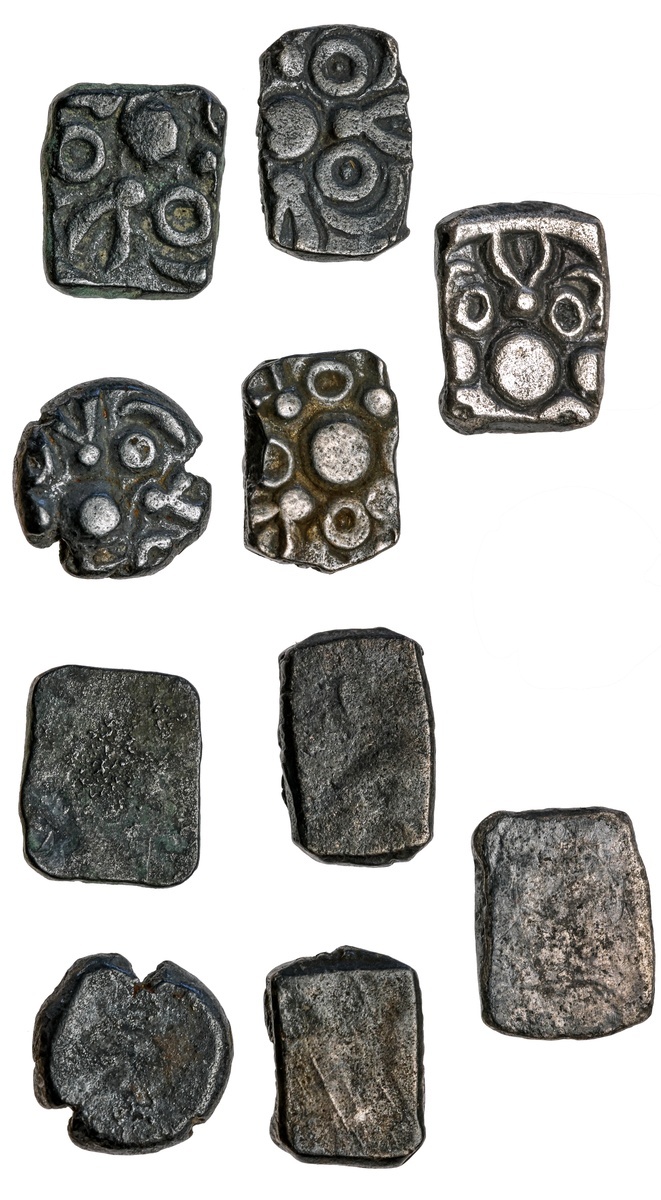 Ancient India. Avanti. Punchmarked coinage. Group of AR ¼ Karshapana, 5th Century BC. Large pellet with taurine and geometric symbols around. Toned. Very Fine. (5)