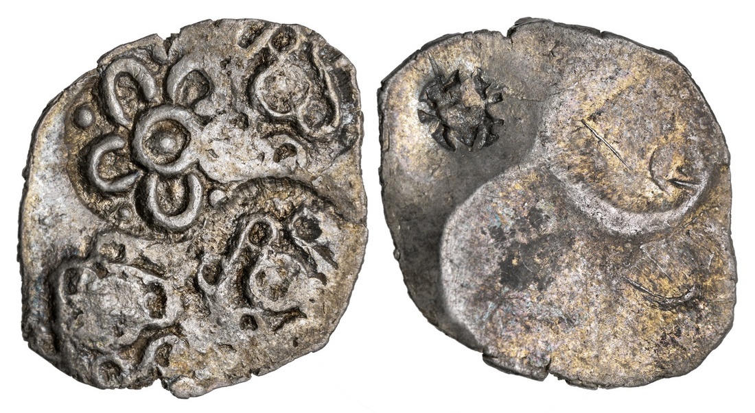 Ancient India. Erikaccha (Erich) in the Raath-Hamirpur region. Punchmarked coinage. AR ½ Karshapana, ca. 500-400 BC. 1.57 gms. Floral symbol repeated three times. Mitch.ATEC 3743. Rare. Good Very Fine.