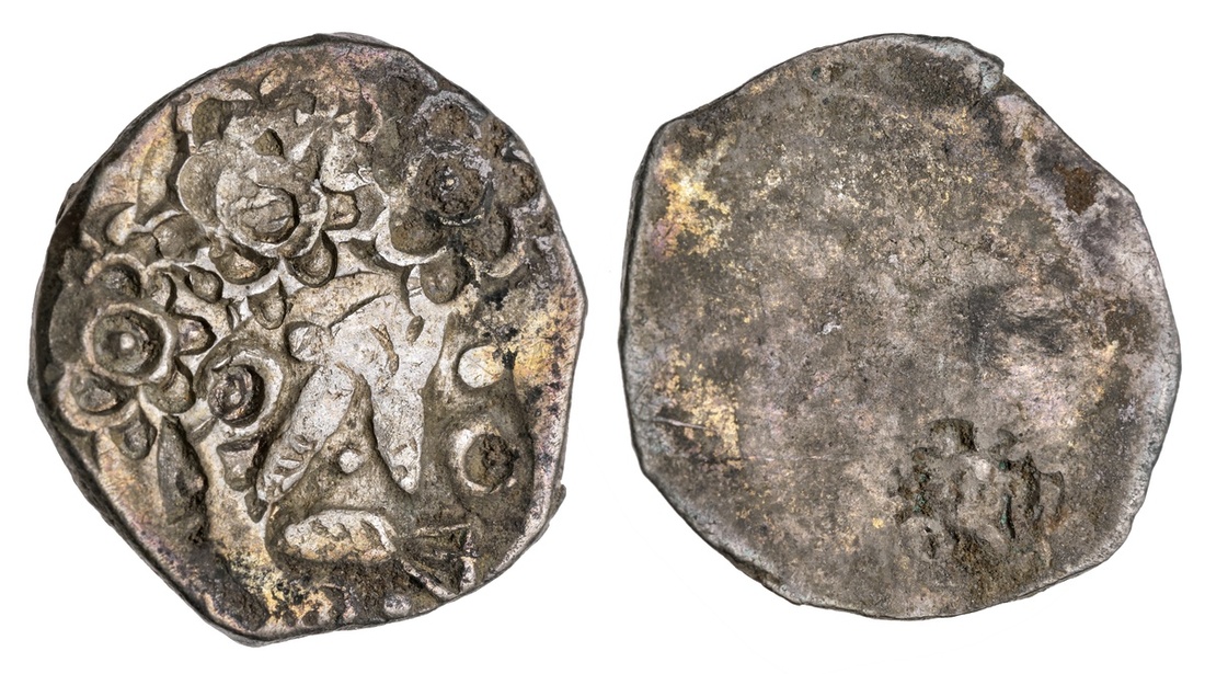 Ancient India. Erikaccha (Erich) in the Raath-Hamirpur region. Punchmarked coinage. AR ½ Karshapana, ca. 500-400 BC. 1.71 gms. Floral symbol repeated three times. Mitch.ATEC 3743. Rare. Good Very Fine.