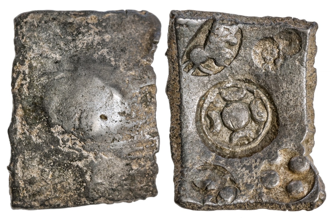 Ancient India. Shakya - Narhan area. AR Double Karshapana, ca. 600-500 BC. 6.51 gms. Central circular punch with four crescents around large pellet, elephant punch and three other bankers' marks. Cf. Rajgor series 33, type 539; Mitchiner ATEC "Narhan-Chinand-Muzaffar Culture", 2195var. About Extremely Fine.
