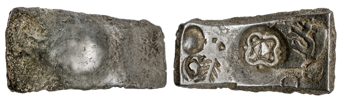 Ancient India. Shakya - Narhan area. AR Double Karshapana, ca. 600-500 BC. 6.55 gms. Central circular punch with diamond with four pellets around within quadrilobe, various bankers marks. Cf. Rajgor series 33, unlisted type; Mitchiner ATEC "Narhan-Chinand-Muzaffar Culture", 2200. Extremely Fine.