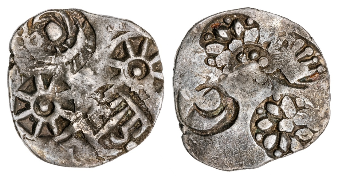 Ancient India. Vatsa. Punchmarked Coinage. AR Karshapana, 500-400 BC. 3.35 gms. Four punches - scorpion, chakra twice and plough. Overstruck on a Chedi Karshapana (elephant, flower petals twice, sun in crescent). Ra-1203var. Rare. Very Fine. Ex Allahabad hoard.