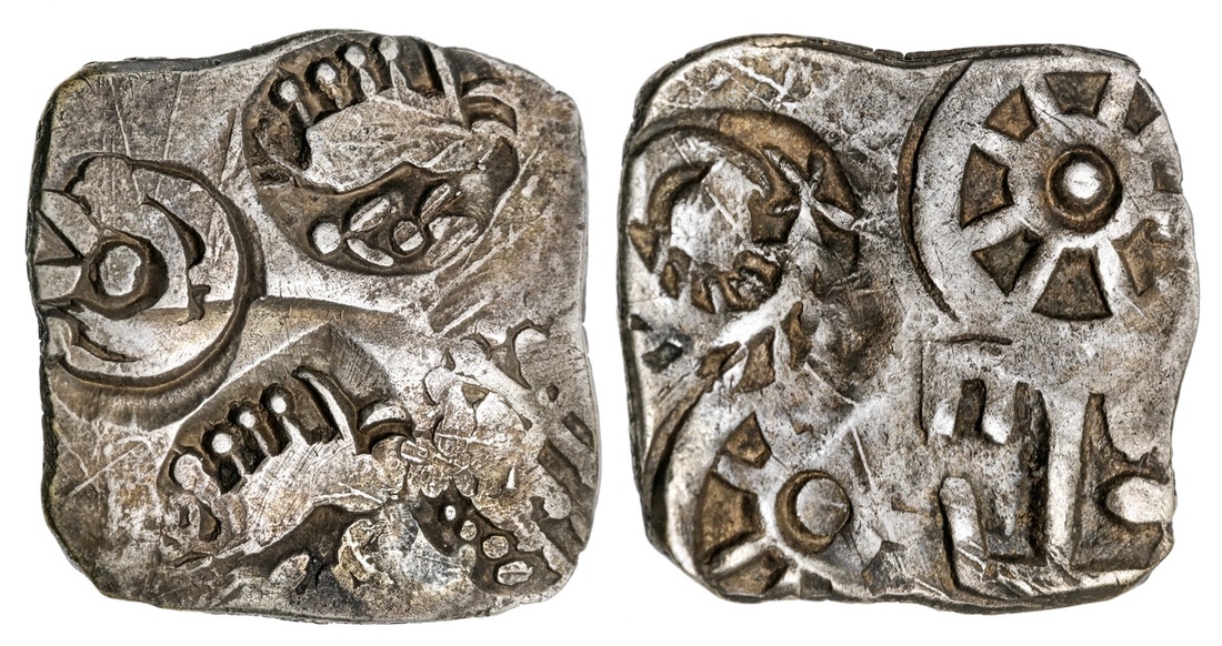 Ancient India. Vatsa. Punchmarked Coinage. AR Karshapana, 500-400 BC. 3.18 gms. Four punches - scorpion, chakra twice and plough. Overstruck on a Kalinga Karshapana (Elephants twice, candelabra and scorpion). Ra-unlisted. Rare. Toned. Very Fine. Ex Allahabad hoard.
