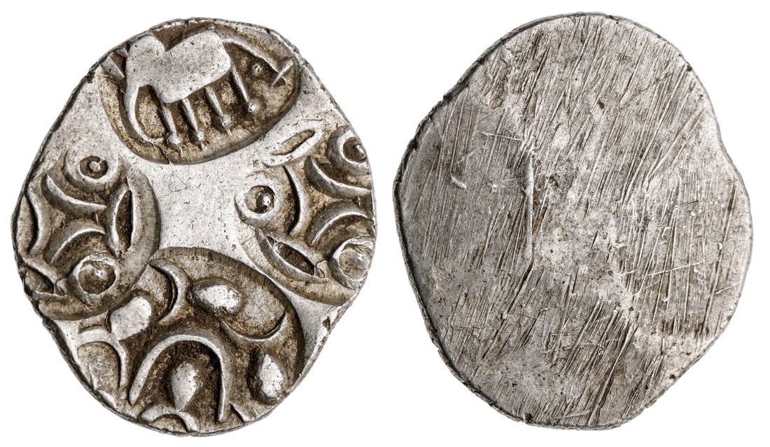 Ancient India. Vidarbha. Punchmarked coinage. AR ½ Karshapana, ca. 5th-4th Century BC. 1.69 gms. Four punches - Elephant left, taurine in crescent with taurines around, and triangle of double crescents pellets in annulets around twice. Ovoid flan. Good Very Fine.