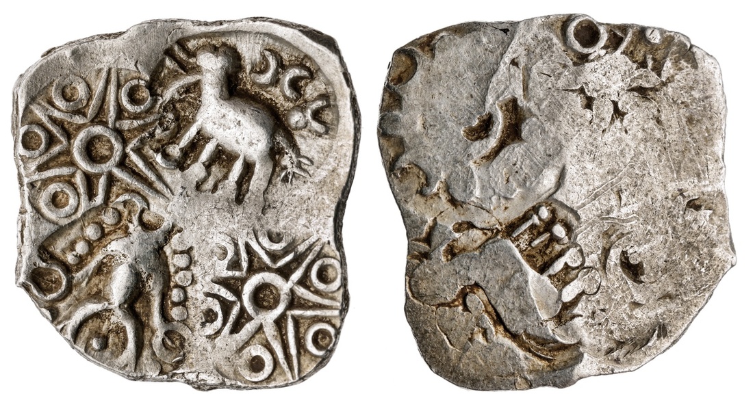 Ancient India. Vidarbha. Punchmarked coinage. AR ½ Karshapana, ca. 5th-4th Century BC. 1.57 gms. From the Vainganga Valley. Four punches - Elephant left double crescent above, ornate taurine, and six-ray star with annulets twice. Squarish flan. VF-EF.