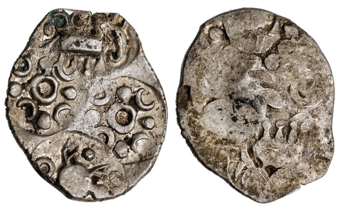 Ancient India. Vidarbha. Punchmarked coinage. AR ½ Karshapana, ca. 5th-4th Century BC. 1.64 gms. Four punches - Elephant right double crescent above, turtle-like creature, four crescents and pellets around annulet twice. Cf. ONS 178. Rare. Ovoid flan. Very Fine.
