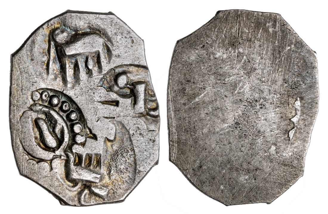 Ancient India. Vidarbha. Punchmarked coinage. AR ½ Karshapana, ca. 5th-4th Century BC. 1.27 gms. Four punches - Elephant left, "eye" in beaded circle, and quadruped back to back twice crescents pellets in annulets around twice. Oblong flan. Very Fine.