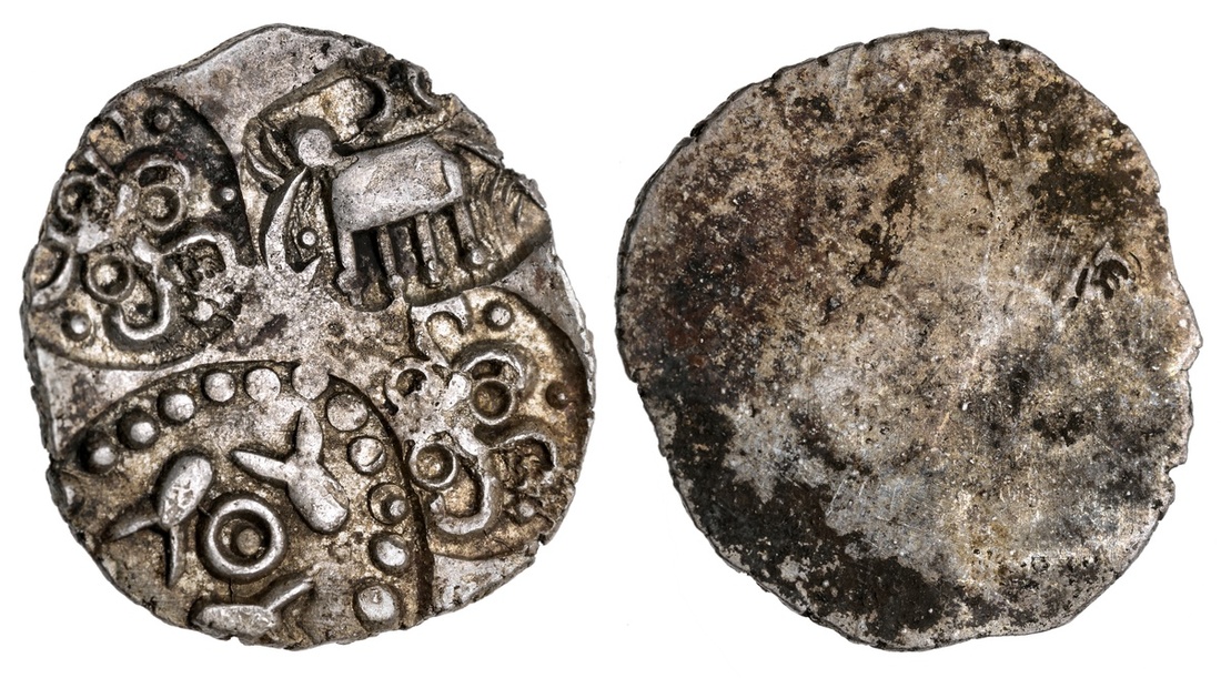 Ancient India. Vidarbha. Punchmarked coinage. AR ½ Karshapana, ca. 5th-4th Century BC. 1.57 gms. From the Vainganga Valley. Four punches - Elephant left double crescent above, three taurine around annulet, whorl symbol with annulets twice. Ovoid flan. Light deposits on blank reverse. Good Very Fine.