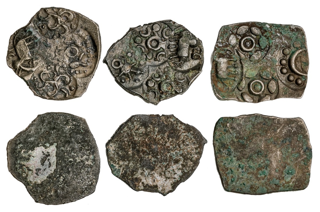 Ancient India. Vidarbha. Punchmarked coinage. Trio of AR ½ Karshapana, ca. 5th-4th Century BC. 1.66 gms. Elephant left, multi-armed whorl with annulet and pellets twice, and three taurine around annulet; 1.74 gms. Elephant right, crescent with six pellets and six-armed symbol twice; 1.63 gms. Elephant left double crescent above, turtle-like creature, four crescents and pellets around annulet twice. All with some light earthen green deposits. Very Fine. (3)