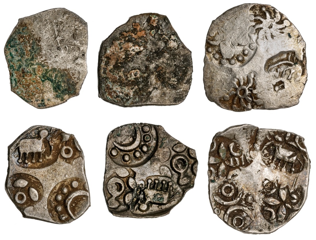 Ancient India. Vidarbha. Punchmarked coinage. Trio of AR ½ Karshapana, ca. 5th-4th Century BC. Elephant right, crescent with six pellets and six-armed symbol twice. Two examples; and elephant, double annulet and "propeller' with crescents in angles twice. Fine-VF. (3)