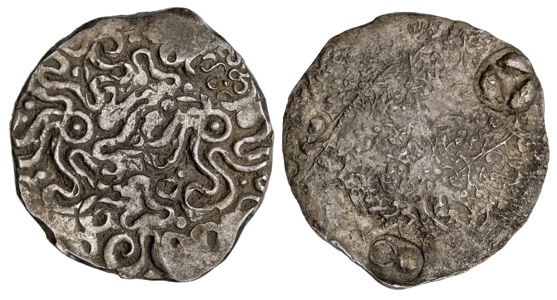 Ancient India. Uncertain Eastern realm. AR Vimshatika, ca. 5th-4th Century BC. 4.41 gms. Unusual geometric pattern suggestive of winding rivers. Taurine and other countermark on back. Little is known of this series which was found in easternmost India. Although north and further west, Panchala has been suggested, while some posit the design as an extension of the "worm" symbol found on Matsya issues. Very Fine.