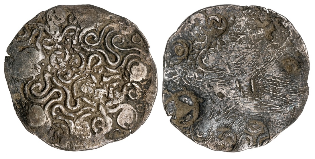 Ancient India. Uncertain Eastern realm. AR Vimshatika, ca. 5th-4th Century BC. 4.44 gms. Unusual geometric pattern suggestive of winding rivers. Seven countermarks on back. Little is known of this series which was found in easternmost India. Although north and further west, Panchala has been suggested, while some posit the design as an extension of the "worm" symbol found on Matsya issues. Very Fine.