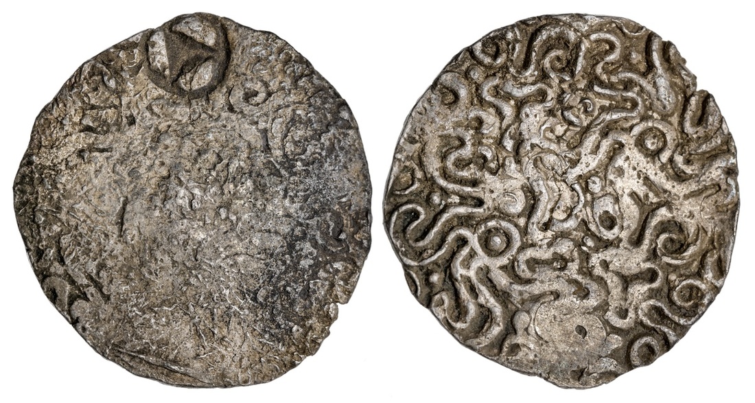 Ancient India. Uncertain Eastern realm. AR Vimshatika, ca. 5th-4th Century BC. 4.21 gms. Unusual geometric pattern suggestive of winding rivers. One countermark on back. Little is known of this series which was found in easternmost India. Although north and further west, Panchala has been suggested, while some posit the design as an extension of the "worm" symbol found on Matsya issues. Very Fine.