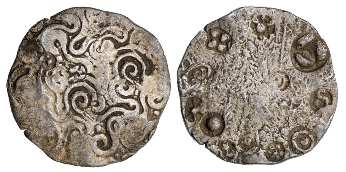Ancient India. Uncertain Eastern realm. AR Vimshatika, ca. 5th-4th Century BC. 4.44 gms. Unusual geometric pattern suggestive of winding rivers. Twelve countermarks on back. Little is known of this series which was found in easternmost India. Although north and further west, Panchala has been suggested, while some posit the design as an extension of the "worm" symbol found on Matsya issues. Very Fine.
