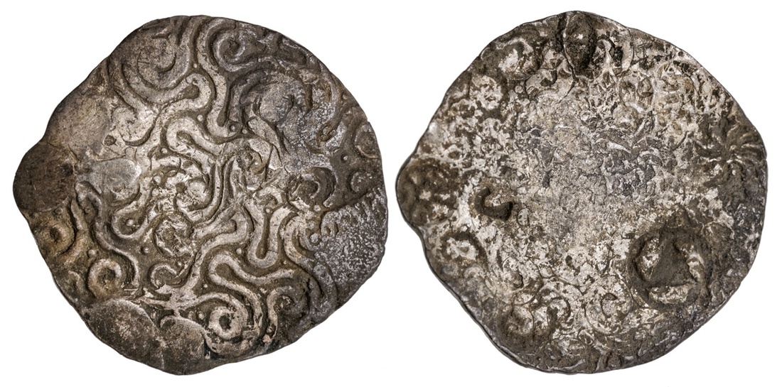 Ancient India. Uncertain Eastern realm. AR Vimshatika, ca. 5th-4th Century BC. 4.34 gms. Unusual geometric pattern suggestive of winding rivers. Seven countermarks on back. Little is known of this series which was found in easternmost India. Although north and further west, Panchala has been suggested, while some posit the design as an extension of the "worm" symbol found on Matsya issues. Some dark areas with deposits at peripheries. Very Fine.