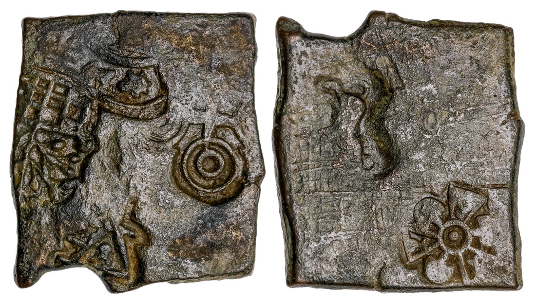 Ancient India. Eran. AE Square Unit, ca. 150-75 BC 8.53 gms. River, railed tree and 2 symbols punchmarks; six-armed symbol and horse. Mitch.4616/17var. EF. Ex SARC Auction 27, Jan. 27, 2017, lot 1923.