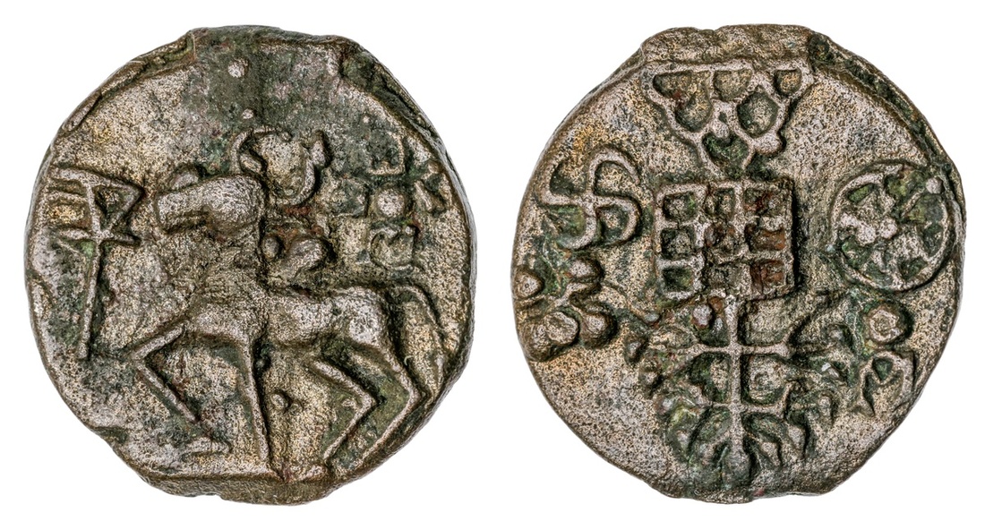 Ancient India. Kausambi. AE Round Unit, ca. Second Century BC. 8.59 gms. Horse left, Indradhvaja left, nandipadas above, rev. Railed tree, chakra left, nandipada above, swastika with Ujjain symbol at right, 6 ached hill at bottom. Mit.4588, Pieper 1129. Very rare. Extremely Fine.