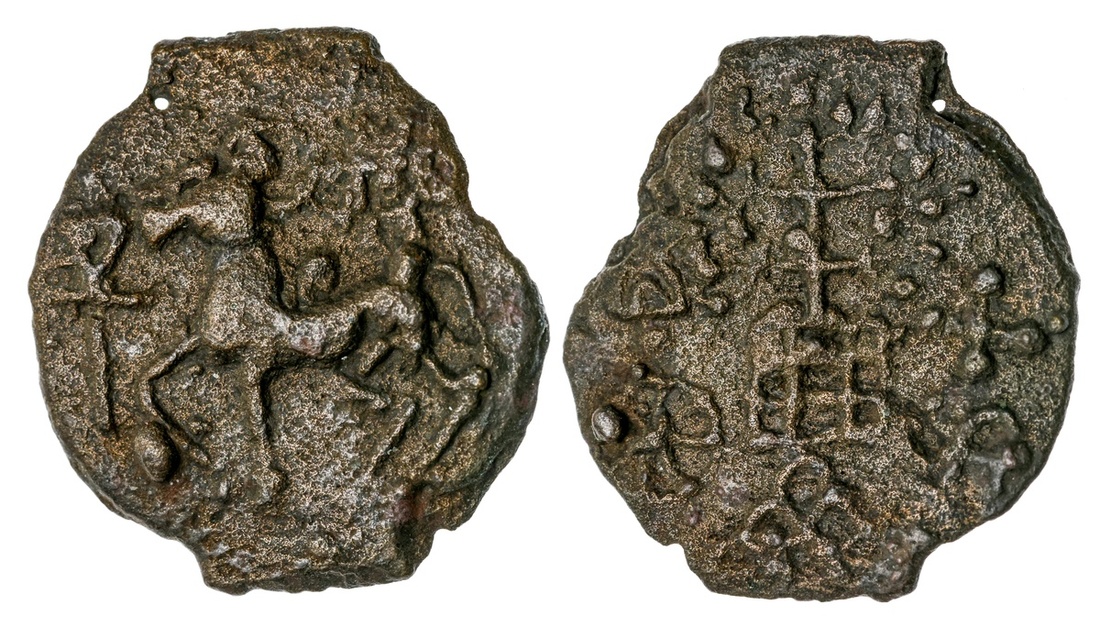 Ancient India. Kausambi. AE Round Unit, ca. Second Century BC. 4.66 gms. Horse left, Indradhvaja left, nandipadas above, rev. Railed tree, chakra left, nandipada above, swastika with Ujjain symbol at right, 6 ached hill at bottom. Mit.4588, Pieper 1129. Very rare. Very Fine.