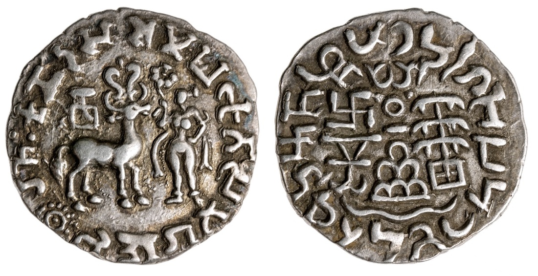 Kuninda. Amoghabhuti (late 2nd Century BC). AR Drachm. 2.25 gms. Deer right, Lakshmi before, vase above, flower petal in legend, rev. Railed tree, swastika, Indradhvaja, river line and nandipada on hill. Cf.Pieper 1140. Full legends both sides. Extremely Fine.