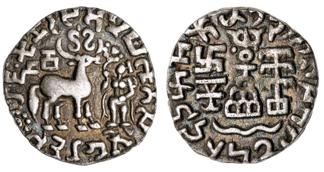 Kuninda. Amoghabhuti (late 2nd Century BC). AR Drachm. 2.25 gms. Deer right, Lakshmi before, vase above, flower petal in legend, rev. Railed tree, swastika, Indradhvaja, river line and nandipada on hill. Cf.Pieper 1140. Full legends both sides. Toned. Good Very Fine.