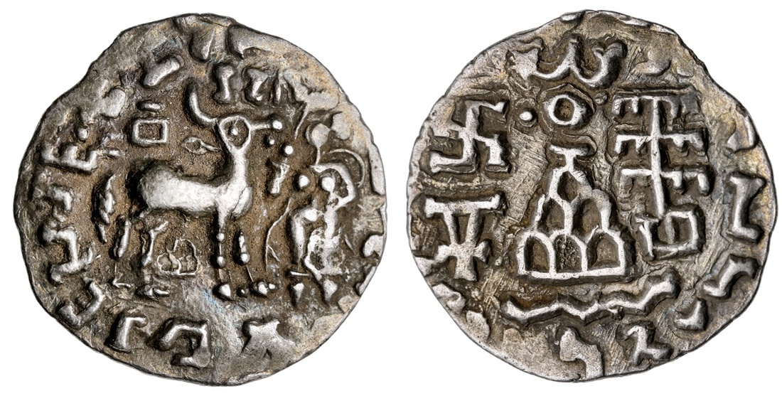 Kuninda. Amoghabhuti (late 2nd Century BC). AR Drachm. 2.08 gms. Deer right, Lakshmi before, vase above, hill below, rev. Railed tree, swastika, Indradhvaja, river line and nandipada on hill. MACW 4440-1, Pieper 1140. Very Fine.